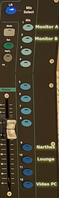 There are 13 mix buttons on the far right side of the soundboard: LR and Mix 1 thru Mix 12. These are the outputs of the soundboard. LR is the main Left-Right mix going to the sanctuary speakers. Mixes 1 thru 12 each send our sounds to the choir monitors, the ceiling speakers in the narthex, to the lounge and nursery, and to the PC that streams our service to YouTube. You can see some of these mixes labeled on the image to the right.